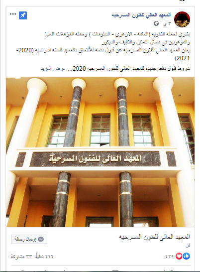 أعلن المعهد العالي للفنون المسرحية أمس الجمعة لائحة الشروط الخاصة بقبول الطلاب الراغبين في الإلتحاق بأقسامه الثالثة وهي التمثيل والدراما والديكور.